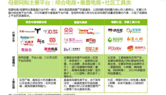 辣妈帮、宝宝树、美囤妈妈、母婴说等这样的育婴平台这两年反而冒出来不少,其实在新的宝妈宝爸的生活圈里,他们越来越少的渠道获取育婴知识了,所以更多的是需要在这类社区里去获取,如果能在获取育婴知识的同时,社区的其他宝妈能分享产品在平台能形成购买的闭环,这类打造母婴内容社区的产业,其实很好的解决了宝妈们的碎片化购物需求。