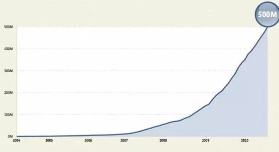 Facebook最初6年的用户人数增长曲线。2010年,月度用户人数达到5亿。
