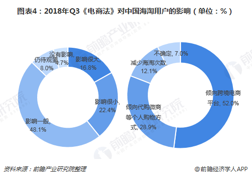 在《电商法》实施后,用户更倾向选择跨境电商平台。有48.1%的用户认为《电商法》的实施对自身海淘行为影响一般,有16.8%用户认为影响很大。而在《电商法》实施后,有52.0%的用户会倾向于使用跨境电商平台,有28.9%的用户倾向于代购等个人购物方式。