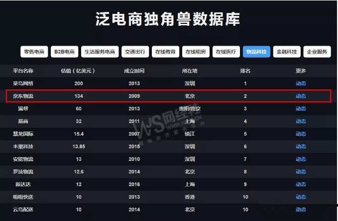 据网经社泛电商独角兽数据库显示,目前京东物流估值134亿美元,位于物流科技全行业非上市公司第二名,仅次于估值为200亿美元的菜鸟网络;而位于京东物流之后的还有满帮(60亿美元)、易商(32亿美元)、慧龙国际(15.4亿美元)、丰巢科技(13.85亿美元)、安能物流(13亿美元)、罗技物流(12.6亿美元)、新达达(12亿美元)、啦啦快运(10亿美元)、云鸟配送(10亿美元)。