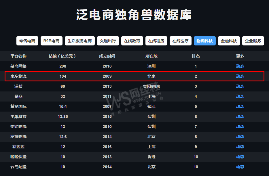 此外,据网经社泛电商独角兽数据库显示,目前京东物流估值134亿美元,位于物流科技全行业非上市公司第二名,仅次于估值为200亿美元的菜鸟网络;而位于京东物流之后的还有满帮(60亿美元)、易商(32亿美元)、慧龙国际(15.4亿美元)、丰巢科技(13.85亿美元)、安能物流(13亿美元)、罗技物流(12.6亿美元)、新达达(12亿美元)、啦啦快运(10亿美元)、云鸟配送(10亿美元)。