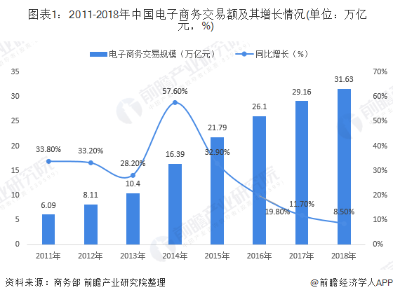 2011-2018年间,我国电子商务交易额持续增长,稳居全球网络零售市场首位,跨境电子商务再上新台阶,与全球电子商务市场联动发展态势愈加明显。《中国互联网发展报告2019》显示,2018年全国电子商务交易额为31.63万亿元,比上年增长8.5%。其中商品、服务类电商交易额30.61万亿元,增长14.5%;合约类电商交易额1.02万亿元,下降51.3%。