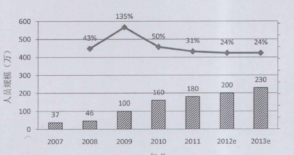 根据中国电子商务研究中心监测数据显示分析显示:我国2007年从事电子商务人数37万人次,到2013年迅速增长,突破200多万人。由于我国电子商务迅速的发展,未来从事电子商务的中小型企业将尝试发展电子商务,从事电子商务的人数将持续增长。