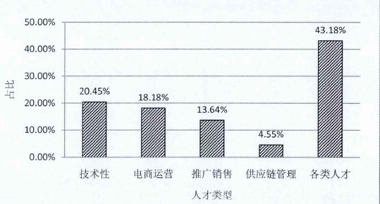 根据中国电子研究中心相关数据显示:我国电子商务最需要的是技术性人才,占20.45%。同时电商运营、推广销售、供应链管理所需人才所占比例分别是18.18%、13.64%和4.55%。同时,各类人才都很缺的企业占43.18%。