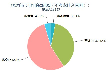 根据相关数据显示:员工对自身工作的满意度达到54.84%,占比一半以上。但是员工对工作不满意程度所占比例也偏高,达37.42%,将近4成。说明在人力资源这一块需要有所改进,提高员工对工作的满意程度。