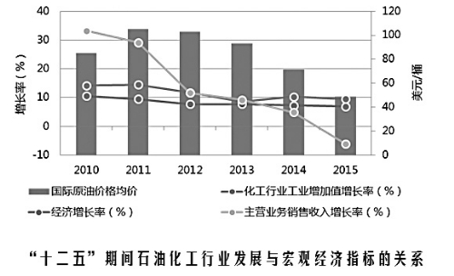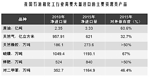 据国家统计局统计,2015年石化化工行业主营业务收入11.78万亿元,同比下降3.4%;利润总额5369亿元,同比增长21.8%;完成固定资产投资1.77万亿,同比下降1.6%;进出口贸易额3609.3亿美元,同比下降12.4%。建材等传统下游市场对大宗石化产品需求增长加速回落,电子信息、航空航天等战略性新兴产业对高端化工新材料的需求主要依赖进口,结构性产能过剩仍然是影响行业健康发展的主要问题。我国油气开采业主营业务收入在石油和化学工业中的占比从2010年的11.39%下降到2015年的7.20%。一次能源消费中石油、天然气的占比分别从2010年的17.4%和4.0%提高到2015年的18.0%和5.9%。有机化学原料、专用化学品等高附加值产业增速加快,在化工行业的占比从“十二五”初的45.4%提高到49.3%,发展增速普遍高于化学工业平均增速3-8个百分点。截至2015年国家和省级石油和化工园区约300个,较2013年增加约40个。化工新材料自给率不断提高。