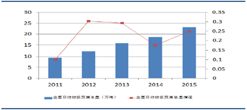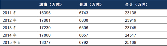 “十二五”期间,随着我国城镇化率的上升及人民生活水平的不断提高,我国垃圾清运量稳步上升,2015年末全国垃圾清运量达到2.5亿吨,年均复合增长率约为2.1%。
