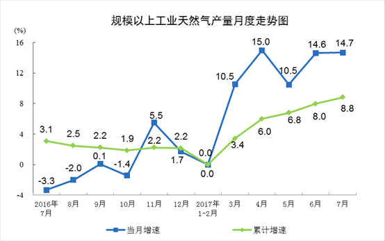 今年以来,得益于国家加快推进天然气利用政策的支持,工业和民用“煤改气”、天然气调峰发电等消费需求旺盛带动,天然气生产持续快速增长。7月份,天然气产量117.4亿立方米,同比增长14.7%,增速比6月份加快0.1个百分点。