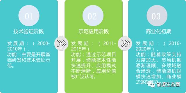 储能的发展从2000年到现在经历了技术验证的阶段,从2011年到2015年经历了示范阶段,从2016年进入了它的商业化应用初期。
