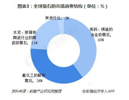 用于炼钢、铸造的冶金级萤石用量大,约占总消费量的40%;用于氟化工的酸级萤石约占36%;用于水泥、玻璃和陶瓷行业的陶瓷级萤石约占21%;其他行业约占3%。