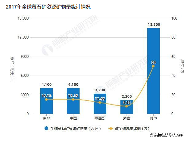 据前瞻产业研究院发布的《全球萤石产业市场前瞻与投资战略规划分析报告》统计数据显示,2017年全球萤石矿资源矿物量约5亿吨,查明的储量约2.71亿吨矿物量。其中,南非、中国、墨西哥与蒙古的萤石储量位列世界前四,共计约占全球总量的50.4%。其中,中国萤石储量与南非并列第一,均达到4100万吨,占世界总储量15.19%。