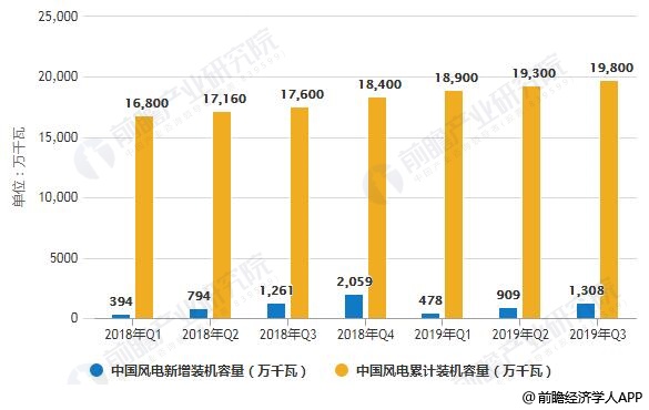 2018-2019年Q3中国风电新增、累计装机容量统计情况
