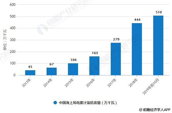 国家能源局发布的数据也佐证了上述观点。2018年,中国海上风电发展迅速。根据中国风能协会统计数据,2018年海上风电新增装机436台,新增装机容量达到165.5万千瓦,同比增长42.7%;累计装机容量达到444.5万千瓦。截至2019年10月,我国海上风电累计并网510万千瓦,已完成“十三五”规划目标的77%。从布局来看,福建、广东、天津等省市实现海上风电并网运行,浙江、辽宁、河北等省项目陆续开工。