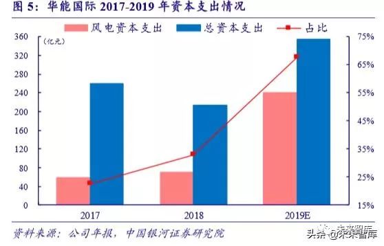 发电集团新能源布局向风电倾斜。2019年发电公司纷纷提高风电投资比重。以华能国际为例,2018年风电资本支出70.37亿元,占比33%;2019年风电支出239.54亿元,同比增长240%,占比提升至67.4%。