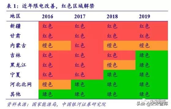 限电改善显著,三北解禁贡献增长。2017年甘肃、新疆等六省被列为红色预警区域,规定不得核准建设新项目。受益于西部用电增长、火电灵活改造、外输通道建成等因素,弃风现象明显改善,区域解禁逐步打开。2019年度风电投资监测预警结果显示,三北地区中黑龙江由橙色转成绿色,吉林由红色转成绿色,为风电装机贡献增长潜力。