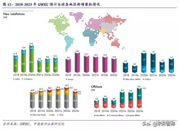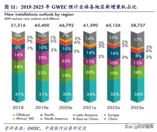 2020年全球或将平稳增长。根据全球风能理事会(GWEC)的预测,2020年全球新增装机66.8GW,陆上风电超过60GW,中国占比大于30%;到2023年之前均可维持每年新增装机55GW以上,至2023年全球累计装机有望达到900GW。