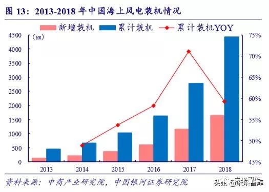 海上风电蓬勃向上。我国海上风电资源丰富,潜力巨大,且靠近东部负荷中心,就地消纳方便。发展海上风电或将成为我国能源结构转型的重要战略支撑。2018年我国海风发展提速,新增装机436台容量1.65GW,同比增长42.7%,排名世界第一。截至2018年底,我国的海风累计装机4.45GW,在建6.47GW,已成为仅次于英国和德国的第三大海上风电国家。