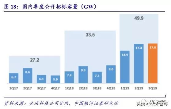 风机招标量快速增长。2019年1-9月,受抢装浪潮影响,国内公开招标量持续上涨,截至三季度总招标量达到49.9GW,同比增长108.5%。其中第三季度招标量17.6GW,创历史新高,同比增长144.44%。
