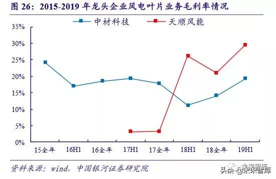 叶片市场景气,销量实现高增长。以叶片龙头中材科技为例,截至2019年中报,公司风电叶片业务合计销售3201MW,销售收入为19.8亿,同比增长134.53%;毛利率达到19.12%,同比增长7.95pct,环比增长5.08pct。