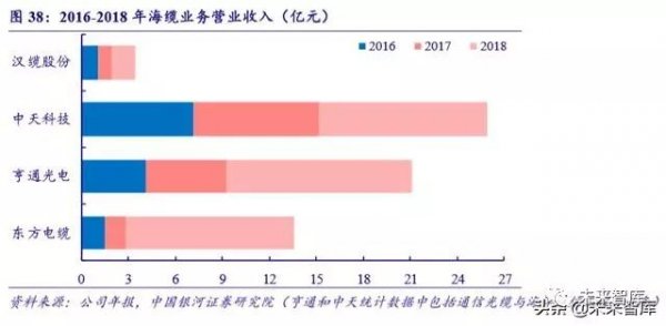 东方电缆的海缆业务弹性最大且快速增长。亨通光电、中天科技以及汉缆股份的海缆业务占比较低,且不是其未来主要发力方向。东方电缆主营海陆电力电缆业务,2018年海缆收入占比超过35%,达10.72亿元,毛利率为29.8%,远高于陆缆的7.75%。截至2019年三季度,公司海缆收入同比增长44.9%,占总收入比重提升至39.5%;中标订单超过19.29亿元,在手订单合计超过25亿元。