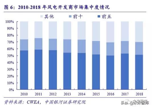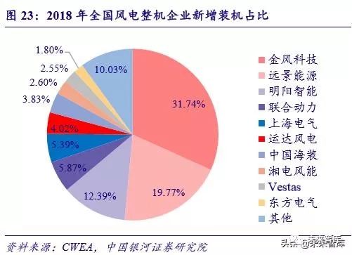 竞争格局基本稳定。CWEA数据显示,2017年新增装机排名前十的整机企业中有8家在2018年依旧位居前十,行业竞争格局基本稳定。金风科技2018年新增装机占比提升5.14pct,远景能源提升4.31pct,明阳智能与联合动力基本持平,行业整体集中度略有上升。