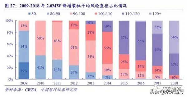 随着风电开发转向海上及低风速区,对风能利用率及重量提出了更高要求,叶片大型化、轻量化趋势明显。根据CWEA数据,2017年,115米及121米叶片是风电市场的绝对主力,但到2018年,121米叶片占领了绝大部分市场,131米叶片也开始批量生产。2019年11月,中国海装的科研人员成功设计研发出风轮直径超过200米的海上风电机组,已获得中国电力科学研究院颁发的设计认证证书。