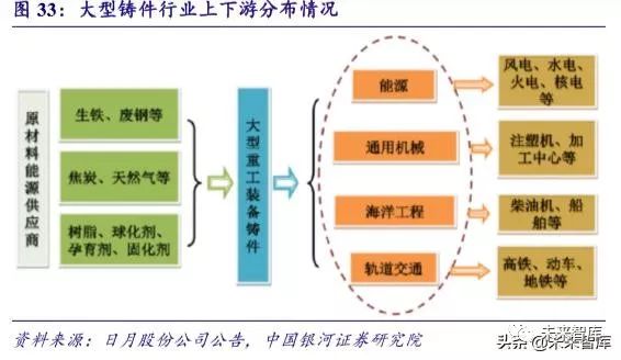 铸件是用各种铸造方法获得的金属成型物件,即把冶炼好的液态金属,用浇注、压射、吸入或其它浇铸方法注入预先准备好的铸型中,冷却后经打磨等后续加工手段后,所得到的具有一定形状、尺寸和性能的物件。从产业链看,大型铸件的上游原材料主要为生铁、废钢和焦炭,下游涉及电力、海洋、通用机械、轨交等众多行业。