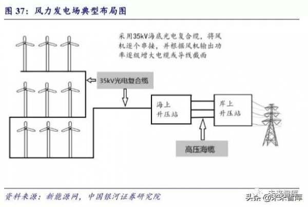 海缆是用绝缘材料包裹的电缆,铺设在海底或水底,用于电力及电信传输。我国海上风电场升高电压通常采用二级升压方式,即风电机输出电压690V经箱变升压至35kV后,分别通过35kV海底电缆汇流至110kV或220kV升压站,最终通过110kV或220kV线路接入电网。