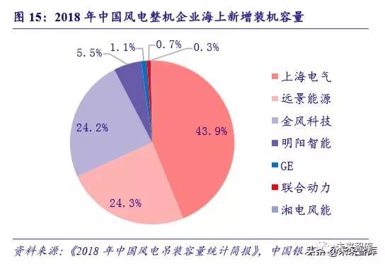 海风整机壁垒更高、市场更集中。海上风电投资大、技术要求高,容易出现行业集中度高的局面。根据《2018年中国风电吊装容量统计简报》,2018年共有7家整机制造企业有新增装机,其中上海电气最多,共达181台容量726MW,占比高达43.9%。排名前三的上海电气、远景能源、金风科技分别实现吊装容量合计1.53GW,占比92.39%,龙头集中效应明显。
