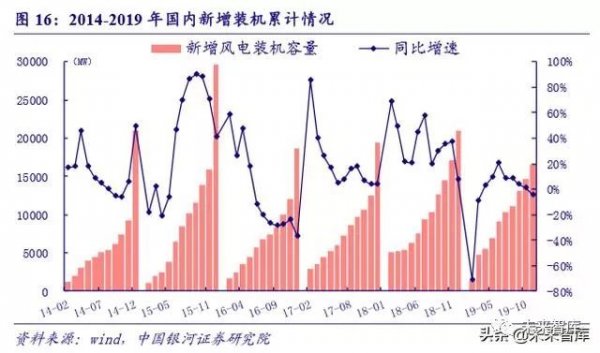 2019年1-11月,全国新增风电装机容量16.46GW,同比下降4.3%,全年有望超过20GW左右。根据彭博新能源的统计数据显示,目前国内已核准尚未开工的项目为58GW,开发商已宣布开发计划的项目为59GW。同时,随着分布式、北方大基地等平价项目的加速推进,项目储备丰富,可支撑未来几年国内风电装机容量增长。基于谨慎偏乐观假设,我们预计2020年新增装机并网量有望接近30GW。