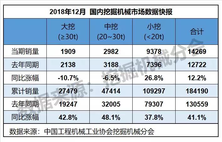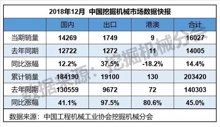 这是一份令人肾上腺飙升的数据:根据中国工程机械工业协会挖掘机械分会行业统计,2018年1—12月纳入统计的25家主机制造企业,共计销售各类挖掘机械产品203420台,同比涨幅45.0%。国内市场销量(统计范畴不含港澳台)184190台,同比涨幅41.1%。出口销量19100台,同比涨幅97.5%。