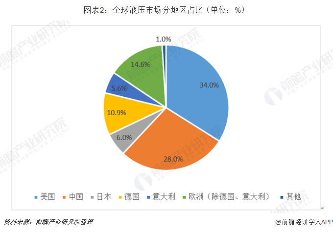 液压行业的市场规模与一国经济总量和工业化水平高度相关,美国、中国、德国、日本、意大利分别为液压产品全球前五大消费国。作为全球第二大经济体和第一大制造业国家,我国液压行业市场规模占全球的28%,仅略低于美国的34%,远高于日本(6.00%)和德国(5.58%)等发达国家。