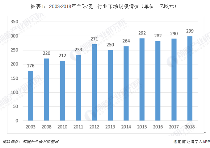 液压产品应用领域广泛,随着产品技术与生产工艺的逐步成熟,液压产品适用领域不断拓宽,全球液压工业已进入相对稳定、成熟阶段。根据中国液压气动密封件工业协会,2018年,全球液压行业市场规模达到299亿欧元。从全球范围内来看,中国液压市场需求增长最快,市场地位显著提升。