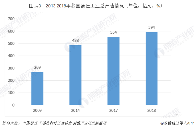 我国液压行业起步于20世纪50年代,历经数十年的努力,我国液压行业的整体技术水平得到了大幅提升,对行业的稳定发展提供了有力支撑。为降低全球金融危机对国内经济的影响,国家加大对基础设施建设等方面的支持力度,液压工业总产值从2009年的269亿元增长到2014年的488亿元,年均复合增长率达到12.65%。此后行业保持一定速度的稳定增长,2017年工业总产值约554亿元,2018年我国液压工业总产值达到594亿元。