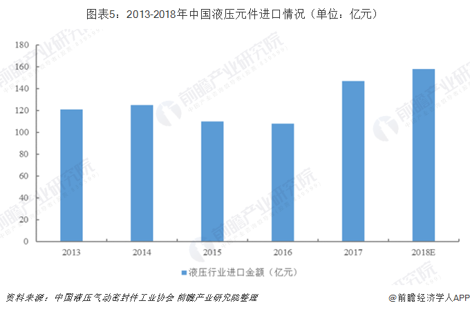 2011年至2016年,随着国内工程机械产销量下滑和国内龙头企业逐步抢占市场份额,液压元件进口市场规模总体呈下降趋势。2017年以来,我国液压元件进口金额稍有提升,由于在房地产投资增长期拉长、基建投资拉动渐强的背景下,工程机械产品需求呈现强劲增长态势,国内液压元件产品供不应求。2018年,中国液压元件进口金额为160亿元左右。