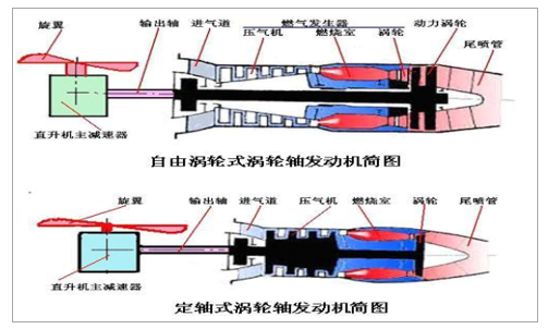 涡轮轴发动机在50年代初期出现之后逐渐代替了直升机的活塞式发动机。目前,在200kW以上的动力装置中,涡轮轴发动机已经占据了统治地位。在较小功率的动力装置中,仍有少数使用活塞式发动机。涡轮轴发动机作为直升机的动力装置,与活塞式发动机相比,主要的优点是重量轻,体积小。例如,同样为功率600kW左右的涡轮轴发动机的重量还不到活塞式发动机的三分之一。其次,涡轮轴发动机没有往复运动的机件,产生的振动和噪音较少。但是,涡轮轴发动机的单位燃油消耗率较高。以小型的发动机为例,涡轮轴发动机与活塞式发动机之间相差约30%。而且在制造成本方面,小型涡轮轴发动机比较昂贵,因而在民用小型航空装备领域,竞争力并没有比活塞式发动机高。