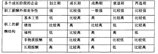 在生命周期的不同阶段,企业的经营能力不同,面临的市场环境也不相同,因此企业适合的薪酬机构和薪酬比例也不相同。企业根据不同的阶段特征制定不同的薪酬模式。在不同成长阶段员工薪酬外部竞争性和员工薪酬结构如下表所示: