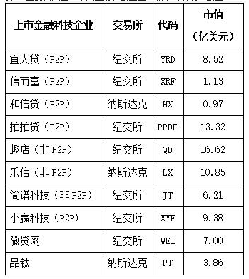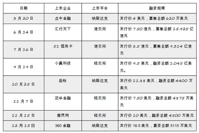 9月19日,中国金融科技公司的小赢科技(XYF)于在纽交所挂牌上市,同样定位为中国金融科技解决方案提供商品钛(PINTEC)于10月25日在美国纳斯达克挂牌上市。11月初,被称为“房抵贷第一股”的泛华金融登陆纽交所。11月15日,“车贷第一股”微贷网(WEI)正式登陆纽交所;同日网贷平台泰然金融向美国证券交易委员会提交了招股说明书,拟挂牌纽交所,计划最高融资2000万美元。12月15日,360金融也正式登陆美国纳斯达克,募集资金5115万美元。