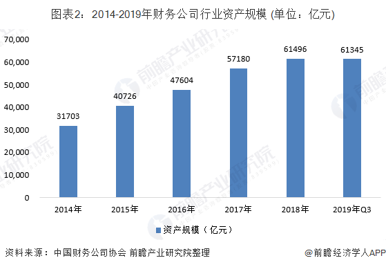 2014-2019年,财务公司行业资产规模不断扩大。截至2018年末,财务公司行业资产规模约6.15万亿元,同比增速8%,资产增速高于银行业平均增速约4个百分点。2019年前三季度,资产规模约6.13万亿元,预计2019年全年继续保持稳健增长趋势
