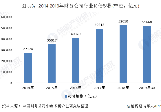 2014-2019年,财务公司行业负债规模不断加大,截至2018年末,负债规模达到5.26万亿元。2019年前三季度,负债规模达到5.17万亿元,预计2019年全年突破5.3万亿元。
