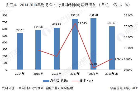 2014-2019年,财务公司行业发展较好,净利呈持续上涨趋势,另外受实体经济环境等宏观环境影响,净利增速波动幅度较大。截至2018年末,财务公司行业净利润达758.78亿元,同比增速为0.73%,下降约21个百分点。