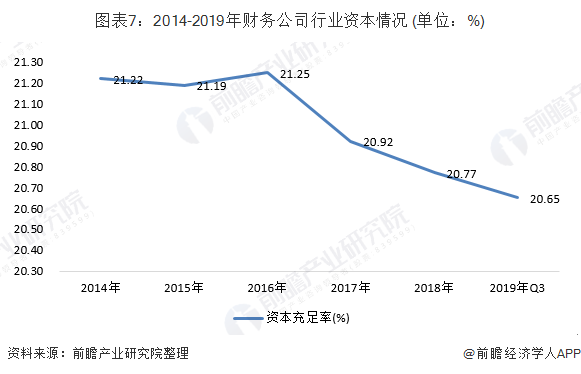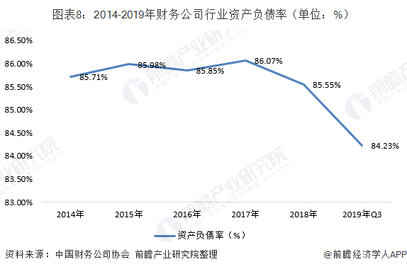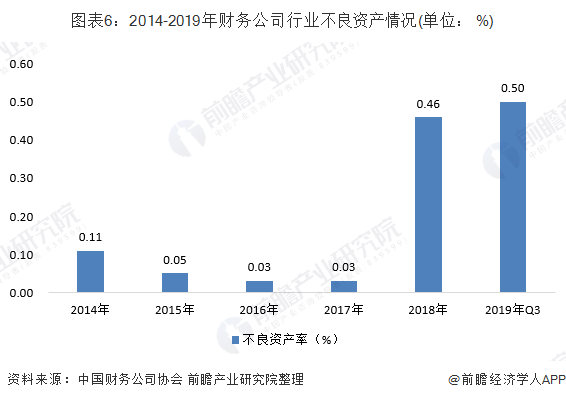 由于我国财务公司行业发展较晚,金融监管经验不足,财务公司运作风险加大。2014-2019年,财务公司行业不良资产率不断上升,表明财务公司行业不良资产增长速度逐渐快于资产增长速度,业务风险加大。2018年末,财务公司行业不良资产余额为316亿元,行业平均不良资产率0.46%,不良贷款率0.96%。2019年前三季度,行业不良资产率达0.5%,超过2018年全年,预计2019-2020年,不良资产率将持续上升。2014-2019年,财务公司资产负债率维持高位,保持在85%以上,财务公司行业资本充足率不断下降,表明风险抵补的能力下降,进一步体现财务公司行业风险加大。