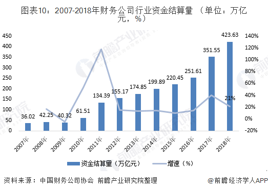 同业业务方面,截至2018年末,财务公司行业存放同业余额2.46万亿元,同比增长8.85%。拆放同业余额561.01亿元,同比增长24.67%,增长较快。中间业务方面。2018年财务公司票据承兑业务发生额8460.34亿元,同比增长22%,增速明显。另外,财务公司行业结算业务规模不断扩张。2007-2018年,财务公司行业结算业务规模由36.02万亿元上涨至423.63,增长了近12倍。