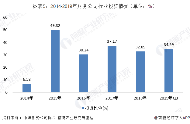 与利润增速波动情况类似,2014-2019年财务公司行业投资比例整体呈波动上升趋势。2015年达到最高投资比例49.82%,主要受2015年修订的《中国银监会非银行金融机构行政许可事项实施办法》的影响,办法规定了财务公司设立标准与投资业务范围,扩大了准入,推动了财务公司行业投资。