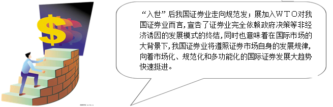 加入WTO后,我国经济将进一步融入国际经济主流,世界经济发展的潮流和趋势无疑将对我国经济产生越来越深远的影响,证券业发展的环境也必将发生剧烈的变化,国内券商将面临更加严峻的竞争形势,但同时也获得了更多的发展机遇。