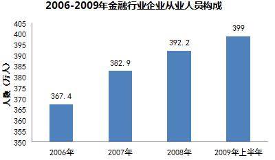 截至2009年6月,金融行业全国从业人数总量达到399万人。自2006年起,金融行业的从业人员数量稳步增长,增长率平均为2.8%左右。其中2008到2009年上半年呈现微小的增长趋势。总体上,2009年相对于2006年增长31.6万人,增长率为8.6%左右。