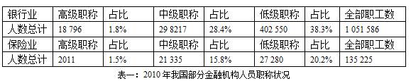表一:2010年我国部分金融机构人员职称状况