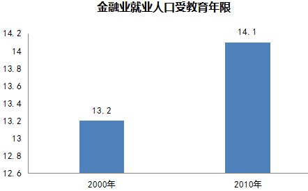 2000年,金融从业人员平均受教育年限为13.2年,在19个行业门类排名第三位。2010年金融业人员平均受教育年限为14.1年,与科学研究、技术服务行业并居第二。2000年到2010年,金融业从业人员人均受教育年限增长0.9年,增幅为6.82%,远高于全社会就业人口9.1年的平均受教育年限,平均受教育程度接近于大专水平。