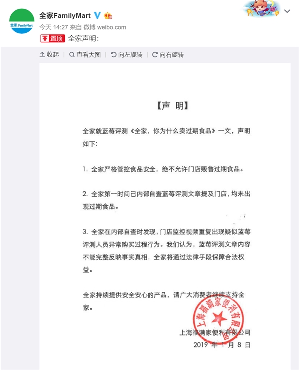 对此全家FamilyMart官方微博发布声明,表示全家严格管控食品安全,决不允许门店贩售过期食品;同时全家第一时间已内部自查蓝莓评测文章提及门店,均未出现过期食品。