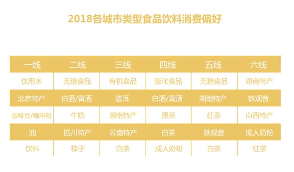 从全国各城市等级类型的食品饮料消费数据来看,一线城市消费者在食品消费上不遗余力,在吃货消费力和消费增幅上都位列第一。从各食品类型各城市类型的占比来看,一线城市偏爱购买饮用水,二线和五线城市偏爱购买无糖食品,三线城市偏爱购买有机食品,四线城市偏爱购买膨化食品,六线城市则偏爱购买特产类食品。
